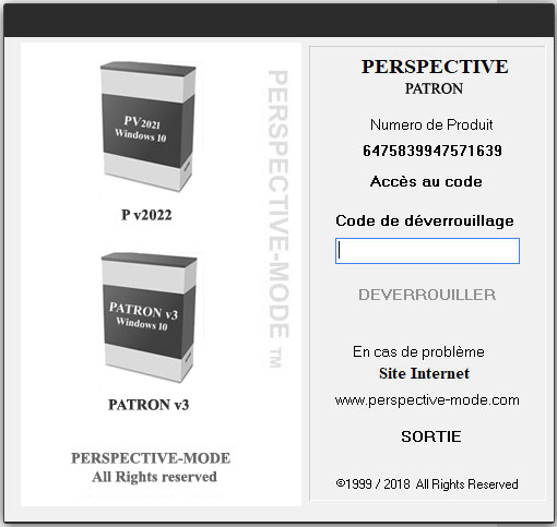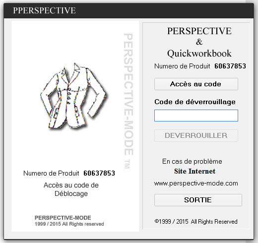 Pour déverrouiller votre version de Perspective il vous faut saisir le numéro de produit (indiqué en bleu sur cette image) dans le formulaire ci-dessous ainsi que votre Nom et votre Mot de passe clientl, vous recevrez ce code par mail dans les minites qui suivent, code à saisir dans le champs Code de déverrouillage puis clique sur le bouton DEVERROUILLER.